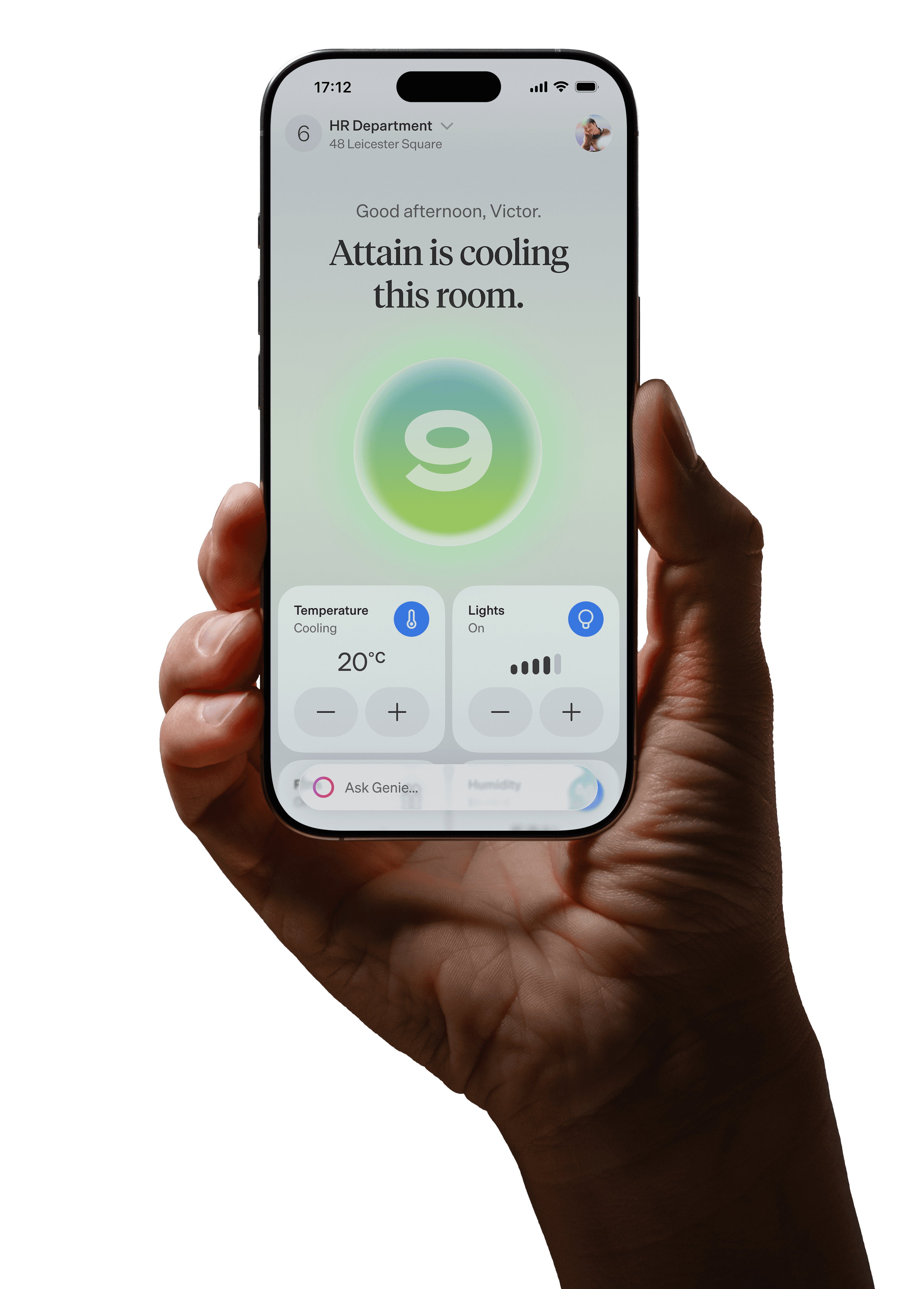 Through one intuitive app, the Attain app lets end users controllighting, temperature, and airflow with ease, customizing their environment in real time in ways that keep your building on-track for Net Zero.